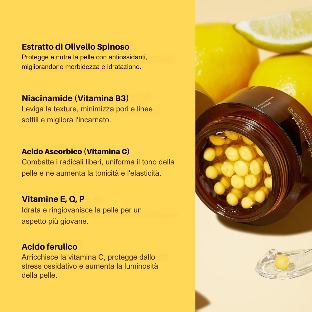 Acqua di Hippophae Rhamnoides, Glicerina, Acqua, Niacinamide, Metilpropandiolo, Propandiolo, 1,2-Esandiolo, Butilene glicole, Dipropilene glicole, Trigliceride caprilico/caprico, Glicereth-26, Etilesil palmitato, Alcol cetearilico, Arginina, Carbomer, Copolimero di ammonio acriloildimetiltaurato/VP, Cetearil olivato, Olio di semi di Helianthus Annuus (Girasole), Sorbitan olivato, Simeticone, Poligliceril-10 laurato, Etilesilglicerina, Adenosina, Fragranza, Poliacrilato-13, Olio di Glycine Soja (Soia), EDTA disodico, Poliisobutene, Gomma di sclerozio idrolizzata, Gliceril stearato, Gluconolattone, Polisorbato 20, Isostearato di sorbitano, Lecitina idrogenata, Olio di semi di Bixa Orellana, Stearato di poligliceril-10, Alfa-arbutina, Pantenolo, Sodio ascorbil fosfato, Glicole pentilenico, Acido ferulico, Tocoferolo, Ascorbil glucoside, Acido 3-O-etil ascorbico, Bisabololo, Acido ascorbico, Acido idrossifenil propammidobenzoico, Piridossina, Ubichinone, Biotina, Acido folico, Sodio ialuronato, Ascorbil propil ialuronato, Ascorbil palmitato, Cianocobalamina, Tiamina HCI, Riboflavina, Acido linoleico, Beta-carotene, Rutina, Acido idrossicinnamico